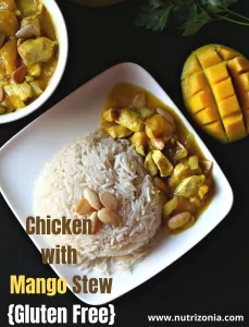 A chicken with mango stew , a comfort healthy meal that you can make in 30 minutes. It’s aromatic, delicious and nutritious too! This meal is gluten free, and you can make it vegan too!