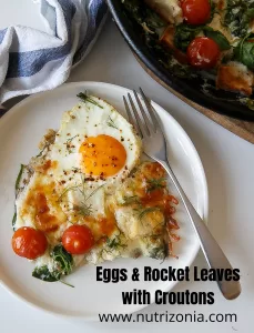 A fairly easy delicious & nutritious breakfast! This dish, Egg & rocket leaves with croutons is a very satisfying, and complete meal, and high in vitamins and minerals. It’s vegetarian and can be made gluten-free!
